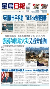 Sing Tao Daily (USPS 13570) is published daily by Sing Tao Newspapers (L.A.) Ltd. at 17059 Green Dr., City of Industry, CA 91745. World rights reserved. Periodicals postage paid at Los Angeles, California and at additional mailing office. POSTMASTER: Send address changes to: Sing Tao Daily, 17059 Green Dr. City of Industry, CA 91745 USA Sub Rate: Home delivery $318/yr. 本材料由 Sing Tao Newspapers Los Angeles Ltd. 代表星島新聞集團有限公司發佈,更多相關信息可從華盛頓特區司法部獲得。 詳刊 A3 詳刊 B1 洛杉磯版 NO.12787 晴天 70℉~44℉ 星期一 2025 年 1 月 20 日 農曆甲辰年臘月廿一 南加 天氣 首批獲釋 3名以色列人質回國 山火救災與資訊戰 構成雙重挑戰 ▍本報訊 ▍ 據《Politico》報導,這可能是特朗普重返白 宮後的首次外出訪察,特朗普在台上向 集會民眾表示,他去探視災區後,會聘請全 球最好的建築商,力求讓當地恢復原貌。 加州洛杉磯野火從本月7月肆虐至今,至 少已造成27人死亡,民主黨籍州長紐森和特 朗普之間關係緊張,雙方並未就野火問題進 行過任何溝通。 另一方面,國家氣象局週日表示,南加 州的聖安娜(焚)風預報情況惡化,並指出從 週一開始將帶來「大規模火災蔓延的風險」。 國家氣象局駐奧克斯納德(Oxnard)辦事 處週日發布最緊急的紅旗火災天氣警告,稱 為「特別危險情況」警報。 氣象局氣象學家表示,洛杉磯和文圖拉 縣的大片區域可能受到影響,包括馬里布和 阿爾塔迪納的燒毀區域。他們警告居民為這 次事件做好準備,預計將從週一中午開始, 持續到週二上午10點。 《洛杉磯時報》(Los Angeles Times)報道, 預計海岸和山谷地區將出現50至70英里/時的 陣風。在山區和山麓地帶,預計將出現60至 80英里/時的陣風,局部地區可達100英里/ 時。 氣象局氣象學家羅斯‧申菲爾德(Rose Schoenfeld)說:「我們建議民眾準備好自身、 親人和寵物的疏散計劃——打包必需品,準 備好緊急逃生包以備不時之需。 為汽車和發電機加滿油,固定好戶外物 品,並調整旅行計劃。」除了馬里布和阿爾 塔迪納(Altadena)外,警告區域還包括伯班 克、聖克拉麗塔、奧克斯納德、千橡市和阿 蘇薩。奧海(Ojai)和帕薩迪納都在警告範圍之 外。 傳統的紅旗警告(表明存在關鍵火災天氣 條件,任何新火源都可能快速蔓延)已經對洛 杉磯、聖地亞哥、橙縣、河濱縣、聖貝納迪 諾和文圖拉縣的大片區域生效,時間從週一 上午10點持續到週二晚上10點。 這次新的警報是國家氣象局奧克斯納德 辦事處(負責洛杉磯、文圖拉、聖塔芭芭拉和 聖路易斯奧比斯波縣)在單個季節內第五次發 布「特別危險情況」強化紅旗警告,這是前所 未有的。 前三次「特別危險情況」警告之後都出現 了火災的引發和快速蔓延——11月在文圖拉 縣發生的19,904英畝的山火,摧毀了243個建 築物;12月在馬里布快速蔓延的4,037英畝富 蘭克林火災,摧毀了20棟建築物;以及本月 的帕利塞德和伊頓火災,這是加州現代史上 最具破壞性和死亡人數最多的火災之一。 奧克斯納德的氣象局直到2020年才開始 發布「特別危險情況」警告。當年10月和12月 發布了兩次。直到2024年11月才再次發布。 週末期間,消防員在強風新威脅來臨之 前,全力遏制太平洋帕利塞德和阿爾塔迪納 仍在燃燒的野火——這些地區都在紅旗警告 範圍內。 將於20日就職的美國候任總統特朗普,19日晚間在華府第一資本體育館(Capital One Arena)的政治集會上,透露自己將於本週五(24日)前往南加州視察野火災情。 ■洛杉磯縣帕利塞德山火災區還未整理,聖塔 莫尼卡再傳紅旗警報。 洛杉磯時報 14日,爾灣市長阿格蘭(Larry Agran)和 五名爾灣市議員,投票選出第三區市議員詹 姆斯˙梅(James Mai)擔任2025年爾灣市副市 長。 爾灣市還有第五區市議員席位仍空缺, 將於4月15日舉行特殊選舉。 當天,詹姆斯˙梅獲得四票勝出,他 得到了市長阿格蘭、市議員Mike Carrol l、 William Go和詹姆斯˙梅的四票。 另一位副市長提名人、第六區市議員 Kathleen Treseder獲得兩票,她得到了市議 員劉令淳(Mel inda Liu)和自己的投票共兩 票。 詹姆斯˙梅是爾灣歷史上的首位越華裔 市議員,他表示,「我競選公職不是為了頭 銜和權力,而是為了奉獻我們這座城市。我 和我們市長會意見不合,也不會永遠達成共 識,但我們都希望為城市服務,確保城市的 需求和市民的需求得到滿足。市民的需求是 最重要的,高於黨派,也高於我自己的個人 事項。」 「能被同事選為爾灣副市長,真的很榮 幸,我已經做好準備為爾灣市民服務。我們 共同致力於為城市的最佳利益而努力。我深 深感謝第三選區選民的信任,我將繼續致力 於代表你們,與我們市長和市議員同事們一 起努力,確保爾灣在未來世世代代繼續茁 壯。」詹姆斯˙梅說。 值得一提的是,民主黨人爾灣市長阿格 蘭,也選擇投票支持共和黨人詹姆斯‧梅。 阿格蘭強調,雖然自己是終身民主黨,但是 也應該在市議會中任命共和黨來擔任重要職 位,因為這才符合無黨派的地方政府的宗 旨。 他指出,在聯邦、州、地方政府這些不 同層級中,地方政府是唯一不受黨派束縛和 影響的。 爾灣首位菲律賓裔市議員、第二區市議 員William Go也投票給了詹姆斯‧梅。他表 示,「我們市議員不僅僅代表自己的選區,而 且也要做出有利於整個城市的決定。我致力 於與同事們合作,為爾灣市做事,確保我們 成為一個團結和運作良好的市議會。」 去年12 月,爾灣市議會討論了誰