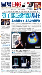 版面索引 Sing Tao Daily(USPS 497120)is published daily by Sing Tao Newspapers(S.F.)Ltd. at 395 Oyster Point Blvd, Ste 215, South San Francisco, CA 94080. Main line(650)808-8800. World rights reserved. Periodicals postage paid at San Francisco, California and at additional mailing offices. POSTMASTER: Send address changes to: Sing Tao Daily, 395 Oyster Point Blvd, Ste 215, South San Francisco, CA 94080. Sub Rate: CA $350/yr. HI , WA , OR State & Other State:$470/yr 本材料由Sing Tao Newspapers San Francisco Ltd.代表星島新聞集團有限公司發佈,更多相關信息可從華盛頓特區司法部獲得。 A 要聞 / 美國 / 國際 / 中國 / 台灣/ 體育 / 香港 B 美西 / 灣區 / 加州 / 社區 / 財經 C 娛樂 E 分類 F 副刊 星期二 2026 年 4 月 21 日 農曆丙午年三月初五 美西版 NO.30578 售價$1.00 Retail price $1.00 灣 區 銷 量 第 一 北 美 銷 量 冠 軍 #1ChineseNewspaper in theBay Area andNorthAmerica 總 機 電 話 : ( 8 0 0 ) S I N G T A O 售價 $0.91 加稅 ($0.91 plus tax) www.singtaousa.com 灣區 雨 59℉~51℉ 夏威夷 雲 82℉~71℉ 西雅圖 雨 57℉~50℉ 高市向靖國神社 供奉祭品 詳刊 A2 綜合美聯社、《華盛頓郵報》、CNN 報道,白宮傳訊總監張振熙(Steven Cheung)20日在社媒平台X上表示:「勞工部 長德雷默將離開政府,前往私營部門任職。 她任內表現出色,保護美國工人的權益, 推行了公平的勞動法規,並幫助美國人提 升技能,改善生活。」副部長桑德林(Keith Sonderling)將任代理勞工部長一職。 德雷默隨後在社媒上發表聲明讚揚了 特朗普,她寫道:「我為我們取得的重大進 展感到自豪,這推進了特朗普總統彌合企 業與勞工之間鴻溝的使命,並將美國工人 的利益放在首位。」她是繼3月原國安部長諾 姆(Kristi Noem)及4月原司法部長邦迪(Pam Bondi )離任之後第三位離任的內閣成員。 前兩人的離任消息,都是由特朗普本人在其 社交媒體帳戶上發布的。 今年1月,《紐約郵報》曾報道勞工部監 察長收到投訴,指控德雷默與一名下屬存在 不正當關係。而《紐約時報》上周報道說,監 察長正在調查她及其高級助手和家人向年輕 員工發送私人簡訊及請求,包括她父親和丈 夫曾向年輕女員工發送私人訊息。她還面臨 濫用職權、工作時間飲酒、出差期間進行私 人旅行等指控。隨著調查的深入,至少有4 名勞工部官員此前已被迫離職,包括她的前 幕僚長和副幕僚長,以及一名被指控與她有 染的安保人員。共和黨參議員甘迺迪(John Kennedy)20日在她離職消息公開後表示: 「我認為部長辭職展現了極大的智慧。」 德雷默曾是俄勒岡州一個搖擺選區的共 和黨眾議員,在2024年11月的選舉中落敗。 在議員任期內,她支持旨在簡化聯邦層級工 會組建流程的立法,以及保護公共部門員工 社安福利的法案。包括國際卡車司機兄弟會 在內的一些知名工會支持她擔任勞工部長, 她本身就是卡車司機工會成員的女兒。一些 政治觀察家認為,特朗普選擇她是為了爭取 工會成員或與工會有關的選民的支持,但是 一些有影響力的工會領袖不相信她會在政府 中推行親工會政策。 德雷默任職部長期間對特朗普忠心耿 耿。去年秋天,她在勞工部總部大樓外牆上 懸掛了特朗普的巨幅頭像,邀請特朗普「來 看看那張印在勞工部大樓前橫幅上的英俊面 孔,因為您真是美國工人的變革型總統」。 德雷默在任內採取了措施來推進政府的 放鬆監管政策,如去年勞工部著手修改或廢 除60多項被認為過時的職場法規。被撤銷的 法規包括家庭照顧者的最低工資要求、取消 施工區域照明標準以及放鬆採礦業的健康和 安全法規等。特朗普政府也取消了勞工部下 屬部門用於打擊全球童工和奴工的數百萬元 國際援助。 勞工部長德雷默離任 涉不當行為遭調查 成特朗普內閣下台第三人 蘋果公司(Apple)20日正式宣布,現任 行政總裁庫克(Tim Cook)將於2026年9月1日 卸任,轉任董事會執行主席;現年51歲的硬 件工程資深副總裁特納斯(John Ternus)將接 任行政總裁一職,成為蘋果歷來第八任掌舵 人。此次人事變動已獲董事會一致通過,標 志著「庫克時代」正式落幕,蘋果邁入硬件老 將掌舵的新發展階段,其AI戰略與產品創新 走向備受全球市場關注。 根據蘋果官方公告及《CNBC》、路透社 等多家財經媒體報道,65歲的庫克將在今年 夏季繼續擔任行政總裁,並與特納斯緊密合 作以確保交接平穩。卸任後,庫克將以執行 主席身分繼續參與蘋果全球政策溝通與重大 戰略事務。同時,現任非執行董事會主席阿 瑟.萊文森(Arthur Levinson)將轉任首席獨 立董事,硬件技術高級副總裁喬尼.斯魯吉 (Johny Srouji)則升任首席硬件官,接掌特納 斯原有職責並擴大職權範圍。 庫克自2011年接替創辦人喬布斯(Steve Jobs)執掌蘋果,任內帶領公司市值從約3500 億美元飆升至逾4萬億美元,增長逾十倍。 在其領導下,蘋果成功拓展可穿戴裝置與服 務業務版圖,推出Apple Watch、AirPods及 Vision Pro等新產品線,並以精準供應鏈管理 聞名業界。 庫克在聲明中表示,能領導蘋果是他畢 生最大榮幸,並盛讚特納斯「擁有工程師思 維、創新靈魂與正直領導之心」,是帶領蘋果 走向未來的最佳人選。 接任者特納斯長期被外界視為庫克頭號 接班人。他統籌過iPhone、iPad、Mac、Apple Watch、AirPods及Vision Pro等全線硬件工程 團隊,在產品研發與設計領域資歷深厚。分 析指出,特納斯上任後首要挑戰將是帶領蘋 果在人工智能賽道上急起直追——目前蘋果 在AI領域布局相對落後於同業巨頭,